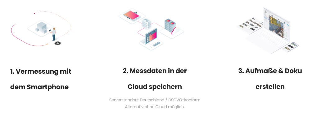 Spezielle Smartphone-Apps verwenden die Sensoren des Geräts, wie Kamera, GPS, LIDAR und IMU, um Objekte zu vermessen. Um den hohen Anforderungen der Bauvermessung gemäß DIN 18710 in Bezug auf Genauigkeit, Präzision und Prüfbarkeit gerecht zu werden, müssen die Smartphones mit einem GNSS-GPS-Empfänger ausgestattet werden.